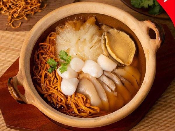 Một món ăn quen thuộc và bổ dưỡng. Bào ngư hầm cùng nấm đông cô, bào sợi vi cá và nước dùng gà, kết hợp cùng các vị thuốc bắc cho ra hương vị ngọt thanh, bổ dưỡng và vô cùng cao cấp.